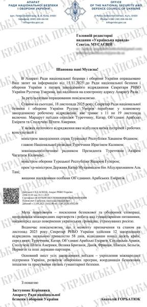 По данным СНБО, 18 ноября Умеров находится в плановой заграничной командировке, которая длится с 11 по 19 ноября включительно. Так, в рамках командировки секретарь СНБО провел ряд встреч и рабочих консультаций с турецкими чиновниками — главой МИД Турции Хаканом Фиданом, главой Национальной разведки Ибрагимом Калином, внешнеполитическим советником президента Акифом Чагатаем Кылычем, главой министерства обороны Яшаром Гулером, а также с премьер-министром Государства Катар Мухаммадом бин Абдулрахманом Аль Тани и с «высшими должностными лицами» Объединенных Арабских Эмиратов, пишет УП.